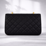 A timeless black quilted handbag featuring a sleek silhouette and elegant gold lock closure. Perfect for evening wear, formal events, and everyday luxury styling.