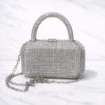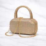 A dazzling gold crystal-studded clutch featuring a structured silhouette, elegant top handle, and detachable chain strap. Perfect for weddings, parties, and glamorous evening events.